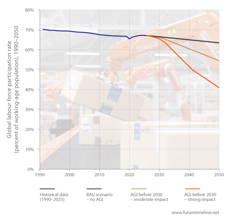 By 2040, the cumulative impacts of automation, robotics, and the widespread adoption of AGI have caused a marked decline in global labour force participation. From over 70% in 1990,* the percentage of working-age (15–64) people in employment had already fallen to 67% by 2025. This downward trend is now accelerating significantly, with potential to reach as low as 41% by 2050. Industries such as transport, manufacturing, administrative services, retail, catering and food services, finance, and healthcare face large-scale job losses.