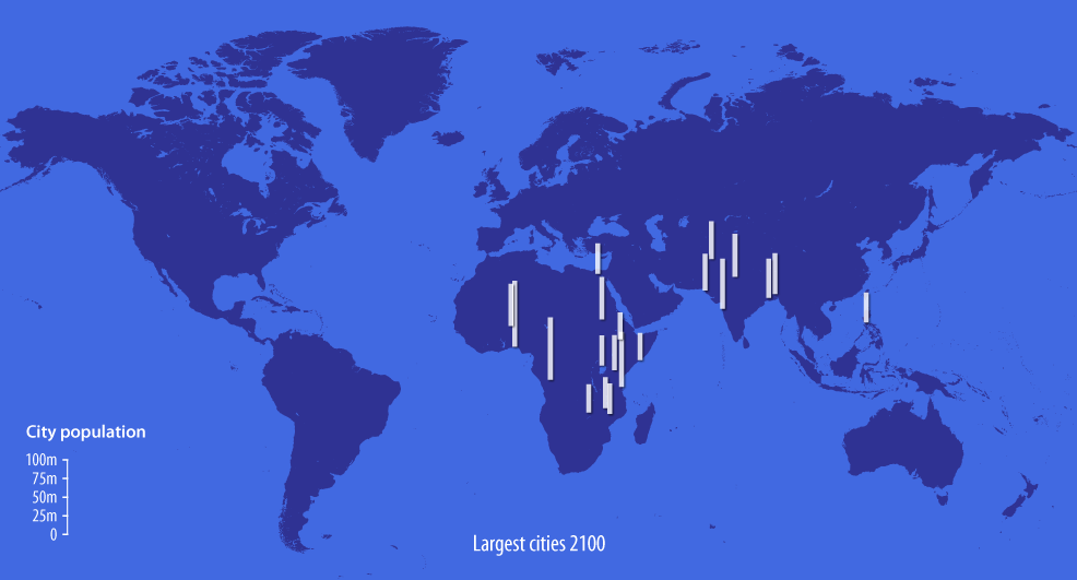Today, in 2100, 13 of the 20 largest cities in the world are African,* up from just three in 2020. The most populous of all is Lagos, Nigeria, which has swelled from 7.3 million a century earlier to more than 88 million now, a 12-fold increase. Other megacities of 2100 include Kinshasa (83m) and Dar Es Salaam (74m).*
