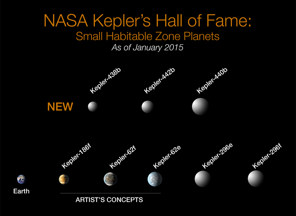 Launched by NASA in 2009, the Kepler space telescope became the first instrument capable of finding Earth-sized and smaller extrasolar planets. Originally the mission was expected to last until 2016, but the second of four reaction wheels (used for aligning the telescope) failed in May 2013 – disabling the spacecraft and putting its future in doubt. However, an alternative plan named K2 "Second Light" was presented for consideration in November 2013. This would involve Kepler operating in a reduced capability mode, but able to continue exoplanet discovery, using an ingenious "virtual" reaction wheel. K2 began in May 2014 and had scanned 35,000 stars by the end of the year. Its first confirmed exoplanet was detected in December 2014, a hot super-Earth 180 light-years away in the constellation Pisces. Combining Kepler's original tally with hundreds of results from K2, a total of 4,175 potential candidates have now been observed, the 1,000th of which was officially verified this week, after a further eight new planets were added to the "confirmed" list. Three of the newly-validated worlds are located in their suns' habitable zone – the range of distances from the host star where liquid water might exist on the surface of an orbiting planet. Of the three, two are likely to be made of rock, like Earth. Kepler-438b and Kepler-442b, pictured here in the top row, are less than 1.5 times the diameter of Earth. Kepler-438b lies around 475 light-years away and is 12% bigger than Earth, while Kepler-442b is 1,100 light-years away and 33% bigger than Earth. Both have relatively short orbits of 35 days and 112 days – similar to that of Mercury (88 days) in our own Solar System. However, their parent stars are smaller and cooler than Sol, making their habitable zones closer. The third, Kepler 440b, is less likely to be a rocky planet. On the bottom row are small habitable zone planets confirmed in previous years including Kepler-186f, Kepler-62e and Kepler-62f.