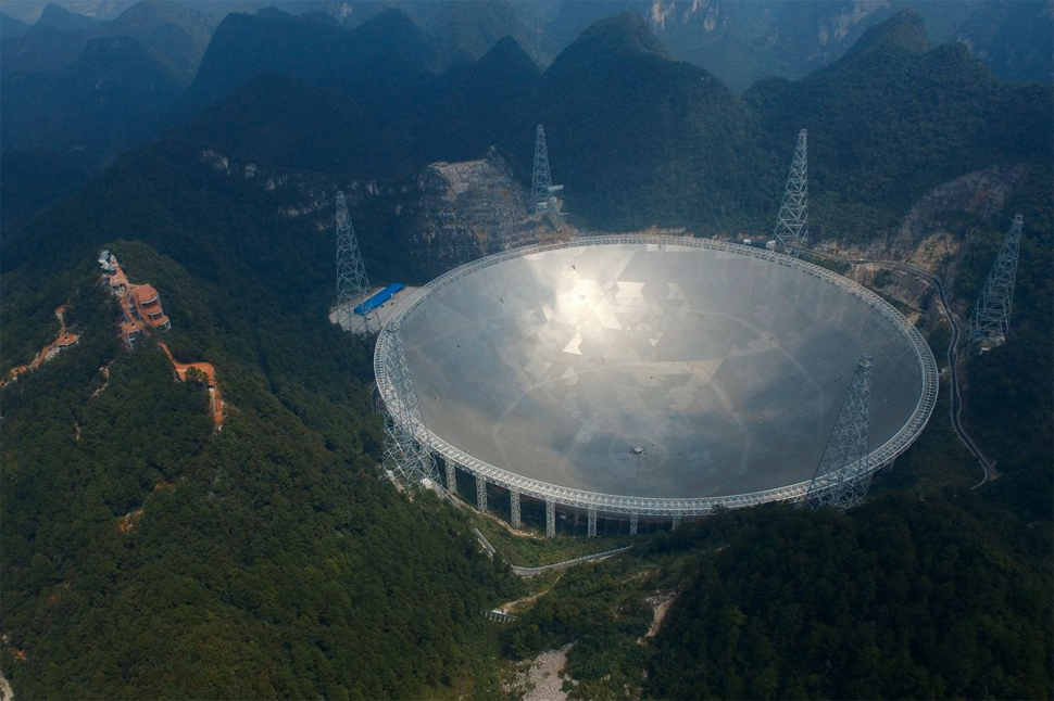 Another entry on our timeline has become a reality, as a major new telescope has just been completed in China, following more than five years of construction and testing. The Five-hundred-metre Aperture Spherical radio Telescope (FAST) is located in Guizhou province, southwest China. Half a kilometre wide and with a collecting area of 2.1 million sq ft (196,000 sq m), it is now the largest single-aperture telescope in the world. It dwarfs the previous record holder, the Arecibo observatory in Puerto Rico, which has a diameter of 305 metres. FAST is able to gaze three times further into space and survey the skies ten times faster than Arecibo. Its primary roles will include mapping the neutral hydrogen within the Milky Way at very high resolution, tripling the number of known pulsars from 2,000 to 6,000, and listening for possible signals from alien civilisations at distances of up to 1,000 light years. Far more stars will be monitored than in previous surveys. The dish itself sits within a natural depression and is unable to be moved, due to its enormous size. However, the surface shape is changeable and the feed cabin (where radio waves are focused) can be moved around. This provides a viewing angle of up to 40° from the vertical. The telescope became operational during a ceremony yesterday. In recent tests, the dish was able to detect radio waves from three pulsars, which are extremely dense and rapidly rotating stars. Over the next few years, astronomers from around the world will be invited to use the facility through a competitive review of observing proposals. "By opening FAST to use by the broader international community, China is demonstrating its commitment to fostering astronomy as a global scientific enterprise," said Douglas Vakoch, the president of METI International. He told the Xinhua news agency that it may lead to "discoveries beyond our wildest imagination."