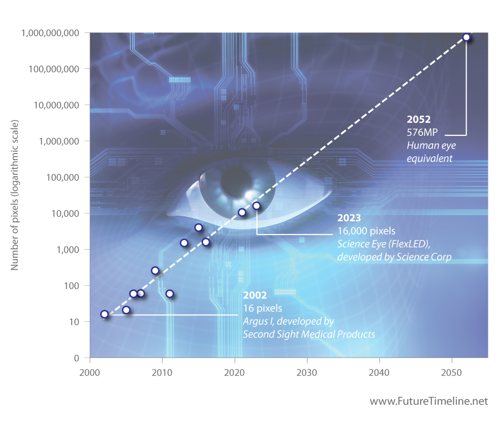 Bionic eye pixel resolutions, 2000-2050 This graph illustrates the rapid progress of bionic eye pixel resolutions from 2000 to 2050. The y-axis shows the number of pixels produced by electrode arrays in various artificial retinas and other visual prostheses, displayed on a logarithmic scale. In 2002, researchers at Second Sight Medical Products created an early bionic eye prototype known as the Argus I. Containing just 16 electrodes, it offered basic functionality that enabled blind patients to detect when lights turned on or off, track simple motion, count discrete objects, and distinguish shapes within their environment. A more advanced model, the Argus II, entered clinical trials in 2007 with 60 electrodes, offering improved visual perception. Over the following decade, companies worldwide significantly increased the pixel resolution of visual implants, hinting at an exponential trend comparable to Moore's Law. The Iridium Medical Technology Company, based in Hsinchu City, Taiwan, developed a retinal prosthesis capable of generating 4,000 pixels – enough for patients "to recognise faces and objects, read big-print books, and navigate easily through life." In 2021, scientists at the Swiss Federal Institute of Technology Lausanne (EPFL) introduced POLYRETINA, a high-density epiretinal implant featuring 10,498 pixels. Tested successfully in animal models, it demonstrated far greater field coverage and resolution than earlier systems. Two years later, in 2023, a startup called Science Corp unveiled its Science Eye, a radically different optogenetic microLED implant with 16,000 pixels, designed to stimulate genetically modified retinal cells and restore partial sight. Science Corp's technology is notable not just for the pixel count, but for potentially being scalable: the company stated that the system could be extended to "hundreds of thousands of pixels" in the future. If the exponential growth in bionic eye resolution continues, these advances could transform vision restoration in the coming decades. Future eye implants in the 2030s and 40s may deliver smooth, full-colour images instead of the coarse, monochrome patterns produced by current devices. Maintaining this rate of progress could eventually yield human-level sight. Scientists estimate that the human retina's photoreceptors provide a resolution roughly equivalent to a 576-megapixel digital camera. Based on the current trend, this resolution could be reached by 2052, as shown in the graph below. Further breakthroughs may push beyond natural limits, producing superhuman vision in the 2060s and beyond. Even healthy individuals might choose to replace their biological eyes with enhanced, cybernetic versions that incorporate additional features – such as real-time zoom, night vision, or continuous video recording.