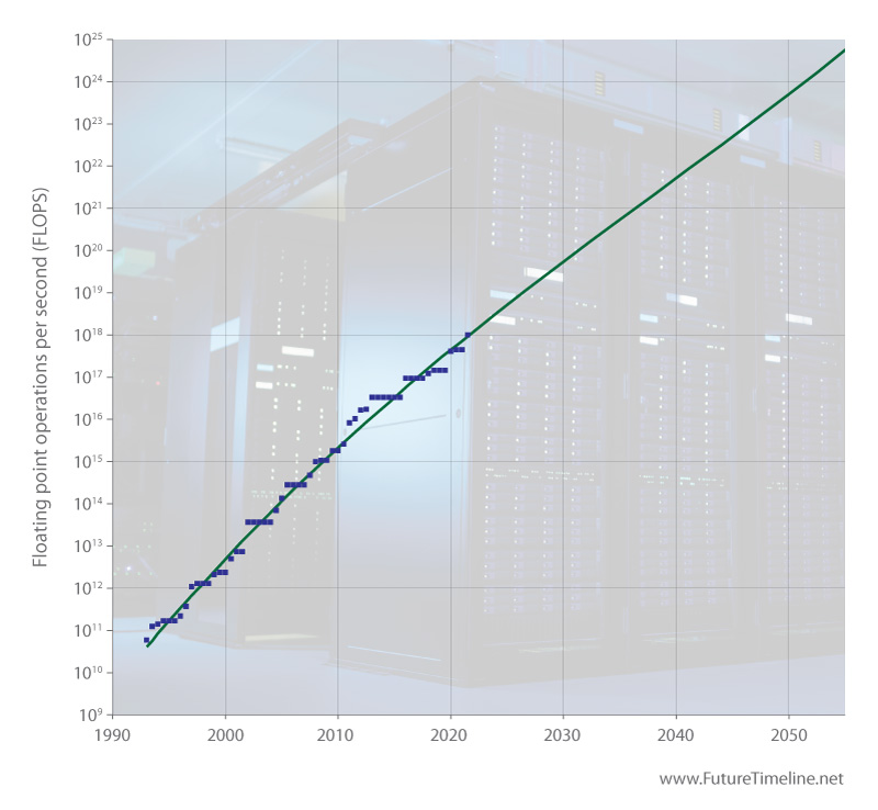 Supercomputers – future predictions Future predictions of supercomputing power are presented below. This graph shows how these machines have developed from the early 1990s through to the present day, with a predicted future trend to 2055.